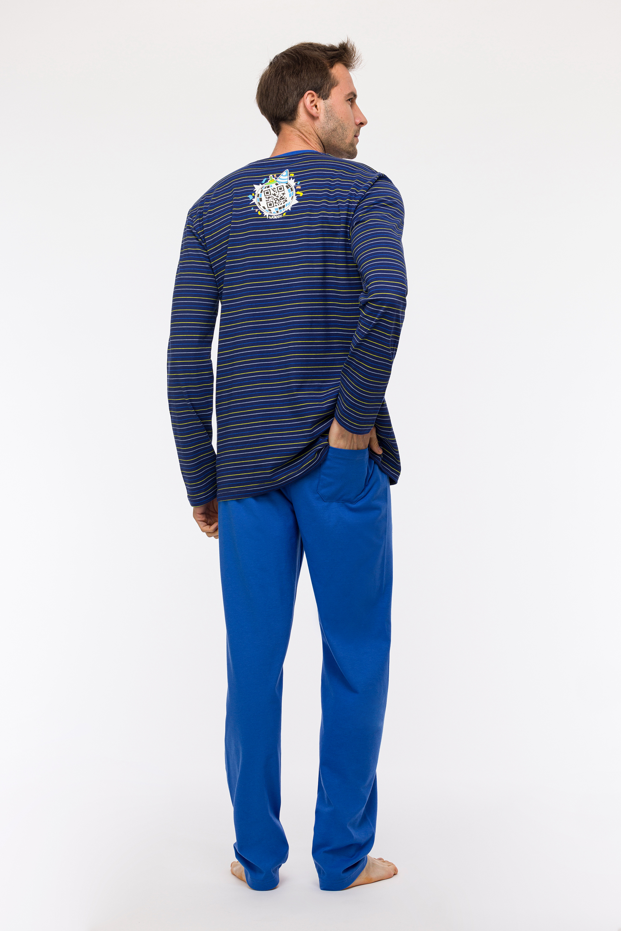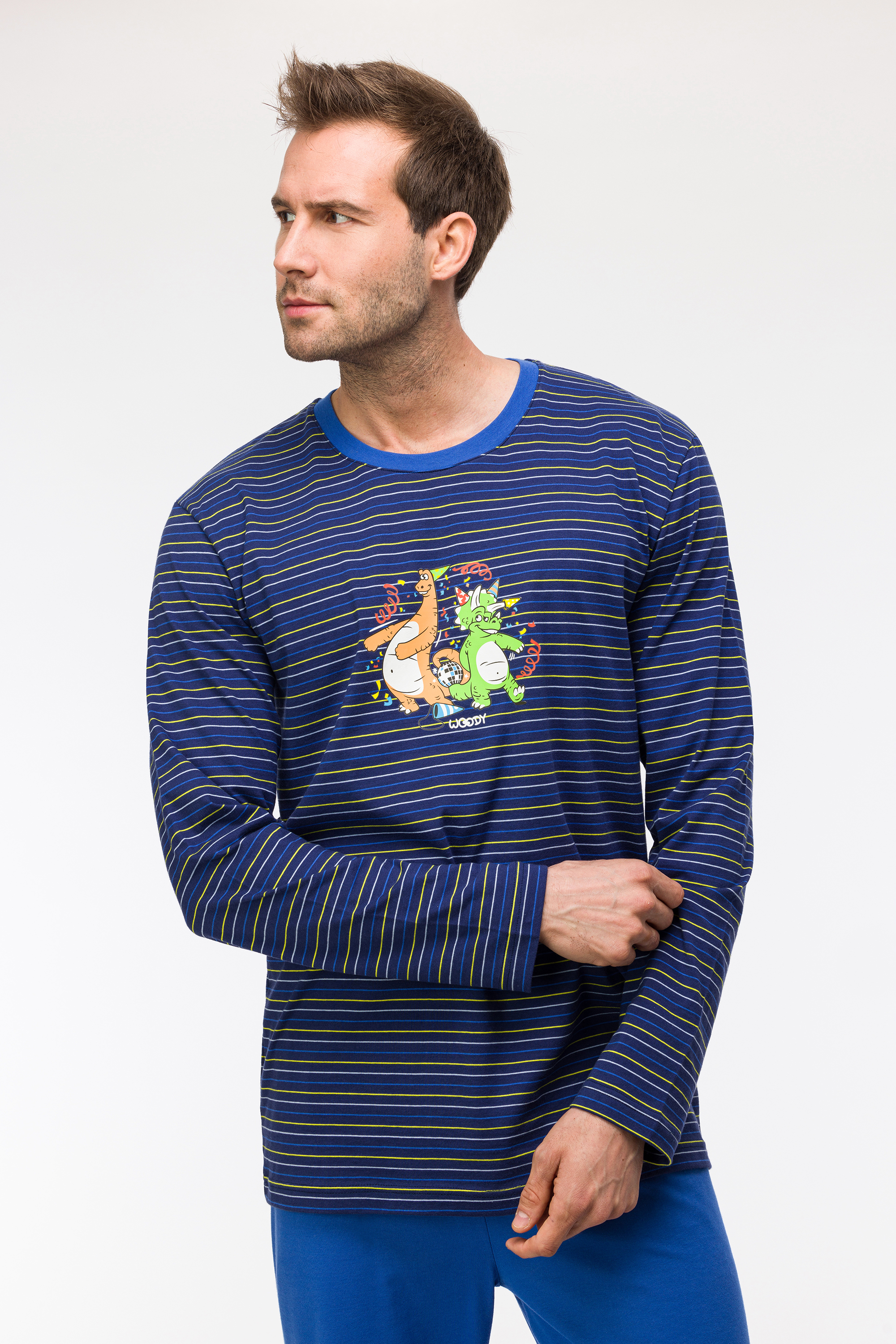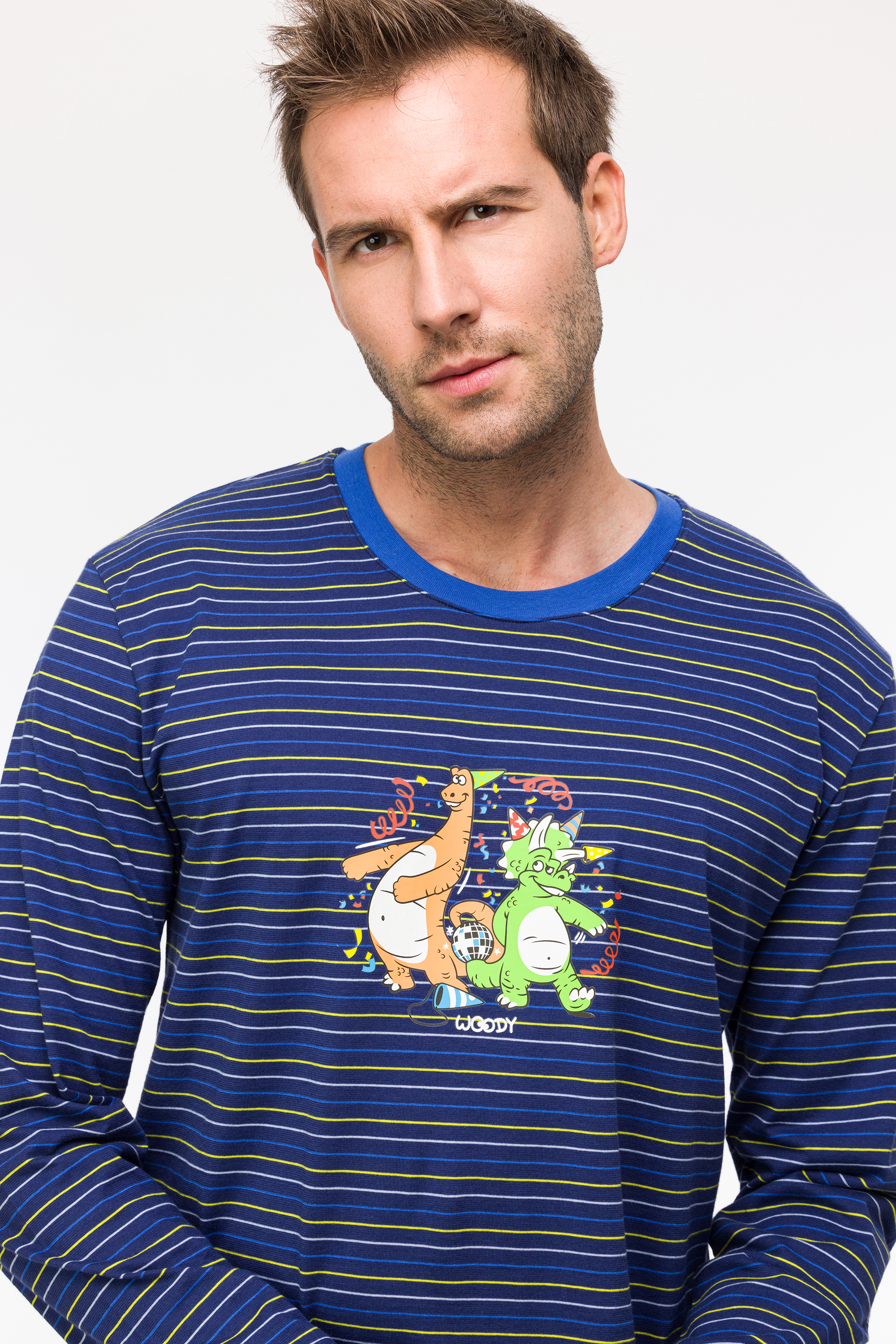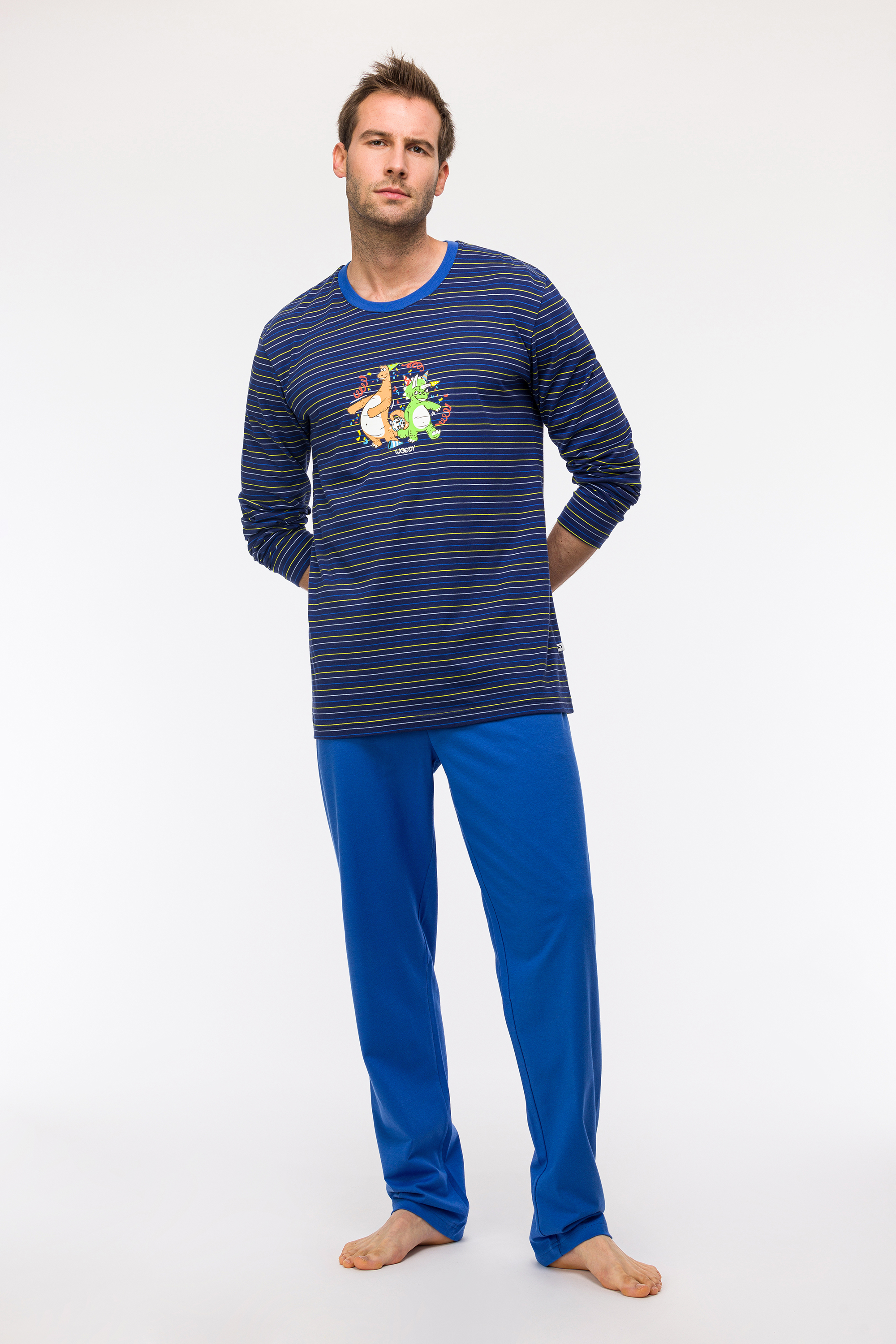 Comfortabele unisex pyjama voorbaby's, kinderen, tieners en volwassenen, in soepel katoen : een lange effen blauwe broek gecombineerd met een gestreepte trui met lange mouwen. Tot en met maatje 8 jaar zijn er drukknoopjes voorzien om het aan-en uitkleden te vergemakkelijken. Dit is onze Woody klassieker, gekenmerkt door de grote glow-in-the-dark Woody print voor- en achteraan op de trui. Je wordt meteen vrolijk bij het zien van deze kleurrijke tekening. Life's a party met onze Woody dino.