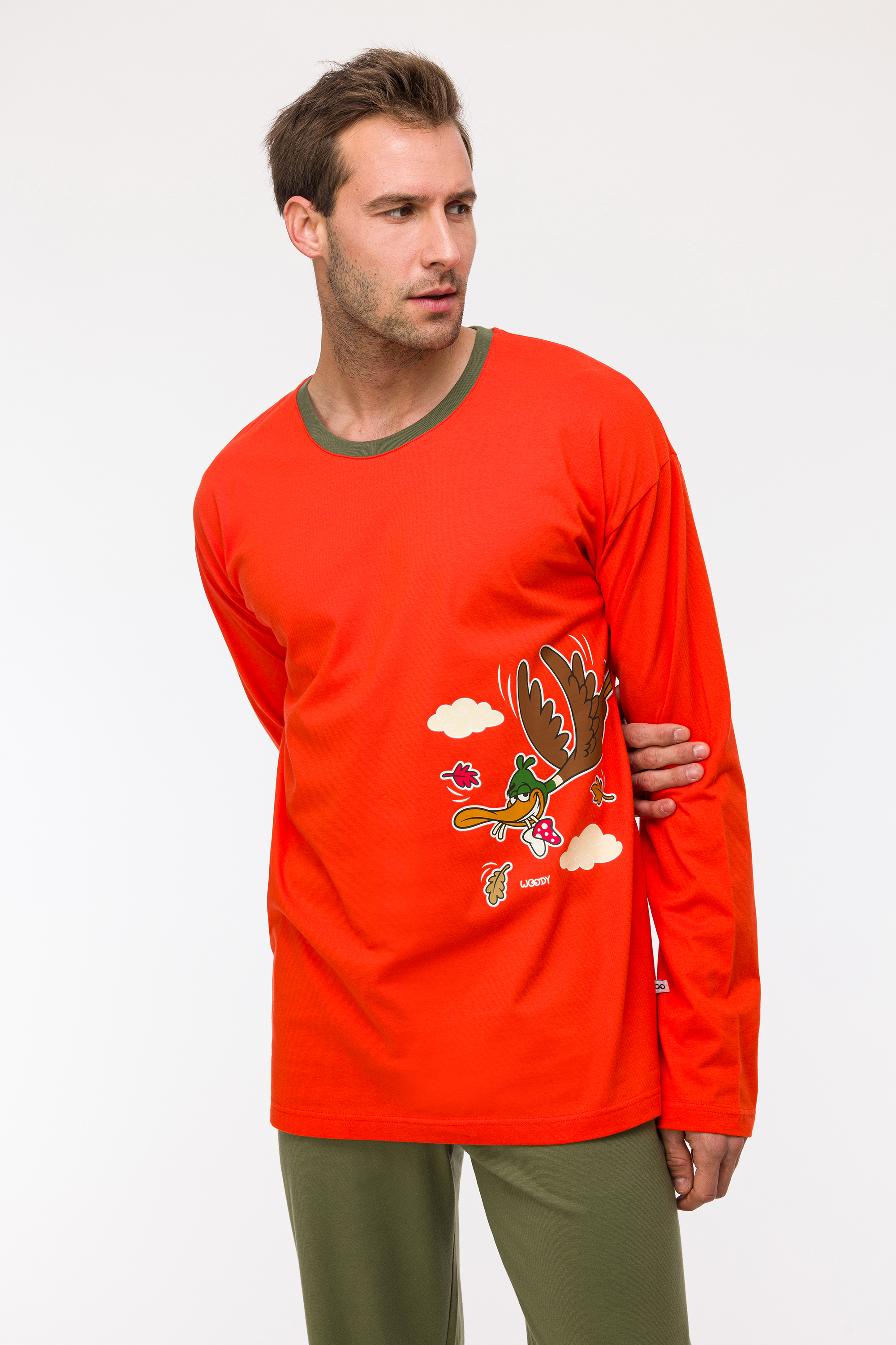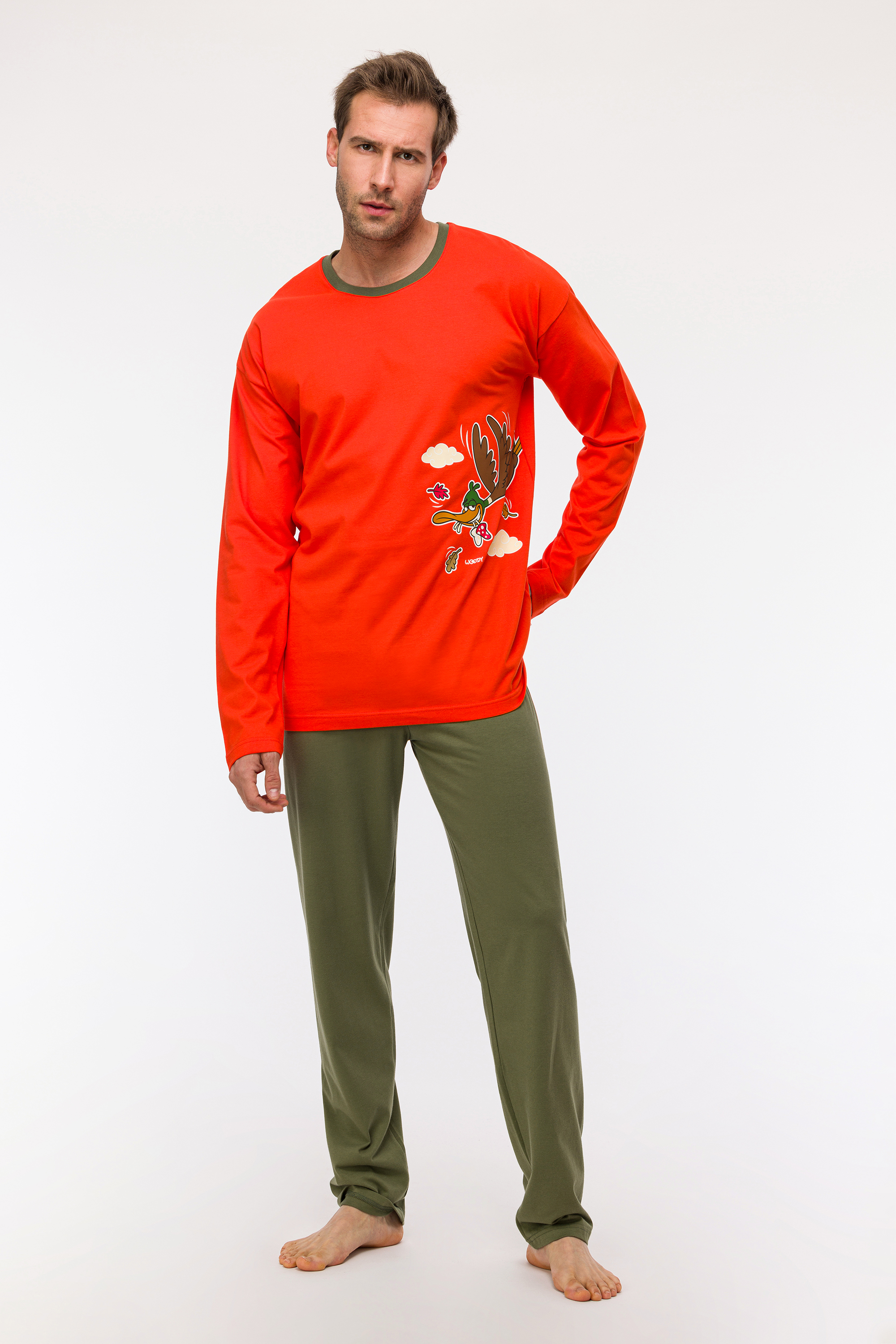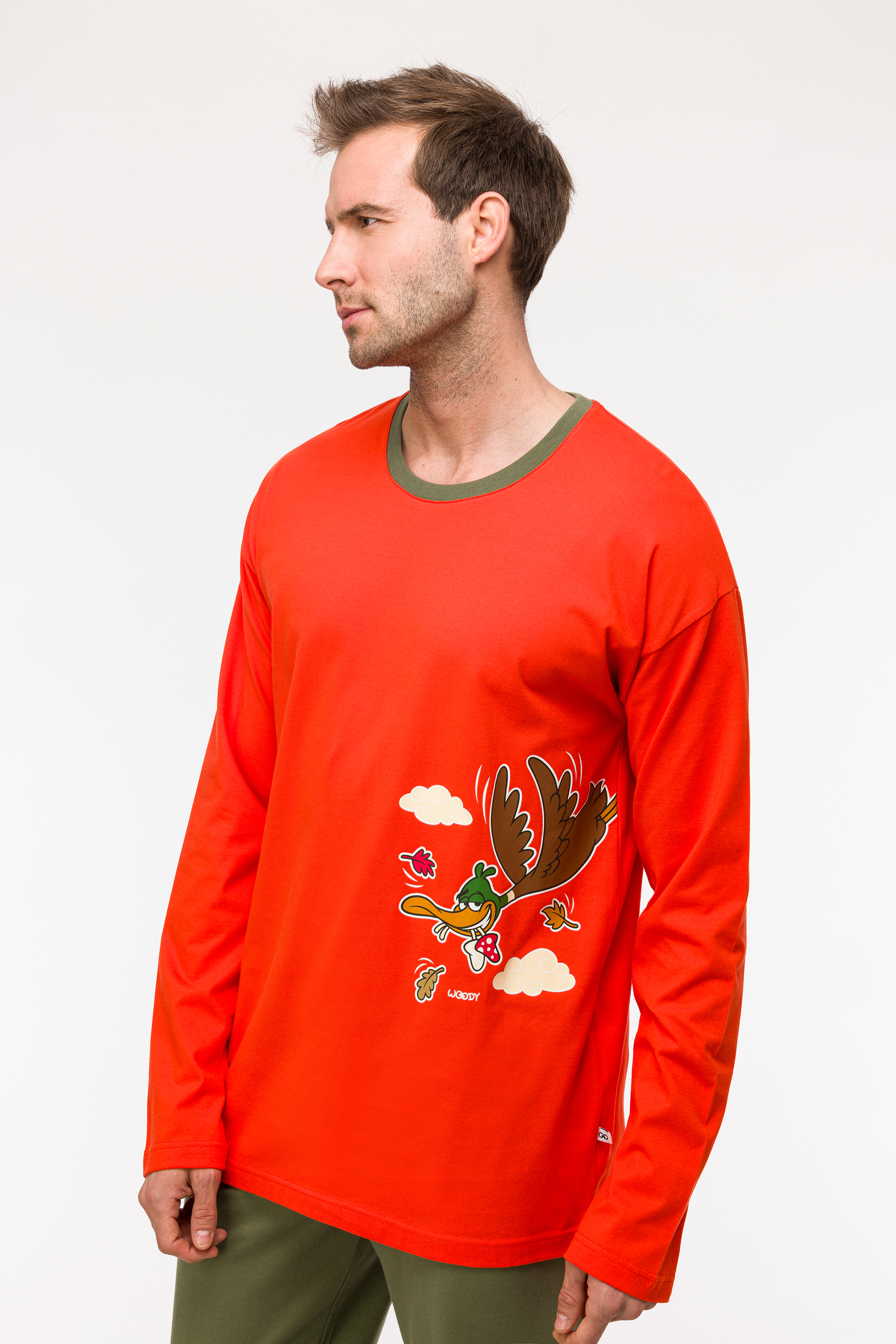 Comfortabele Woody pyjama in soepel katoen voor baby's, kinderen, tieners en volwassenen. Deze set bestaat uit een lange effen kakigroene broek gecombineerd met een effen rode trui met lange mouwen. Van maatje 2 jaar tem. maatje 8 jaar zijn er drukknoopjes voorzien om het aan-en uitkleden te vergemakkelijken. Woody geeft je vleugels ! Deze print licht op in het donker !