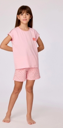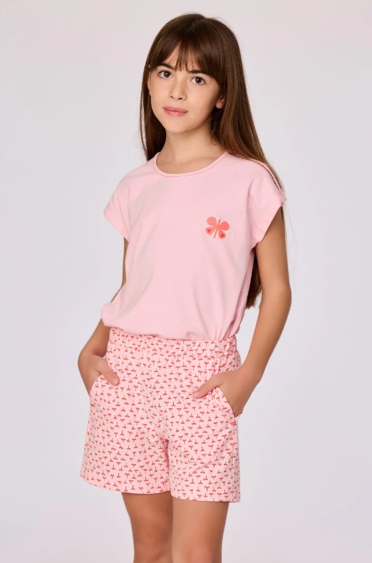Roze pyjama in soepel katoen, heerlijk zacht en comfortabel om in te slapen. De set bestaat uit een lichtroze T-shirt met korte mouwen en een ronde hals. Op de voorzijde staat een centrale rode tekstprint (voor maten XS–XXL), terwijl de kindermaatjes (2Y–16Y) afgewerkt zijn met een subtiele vlinderprint.