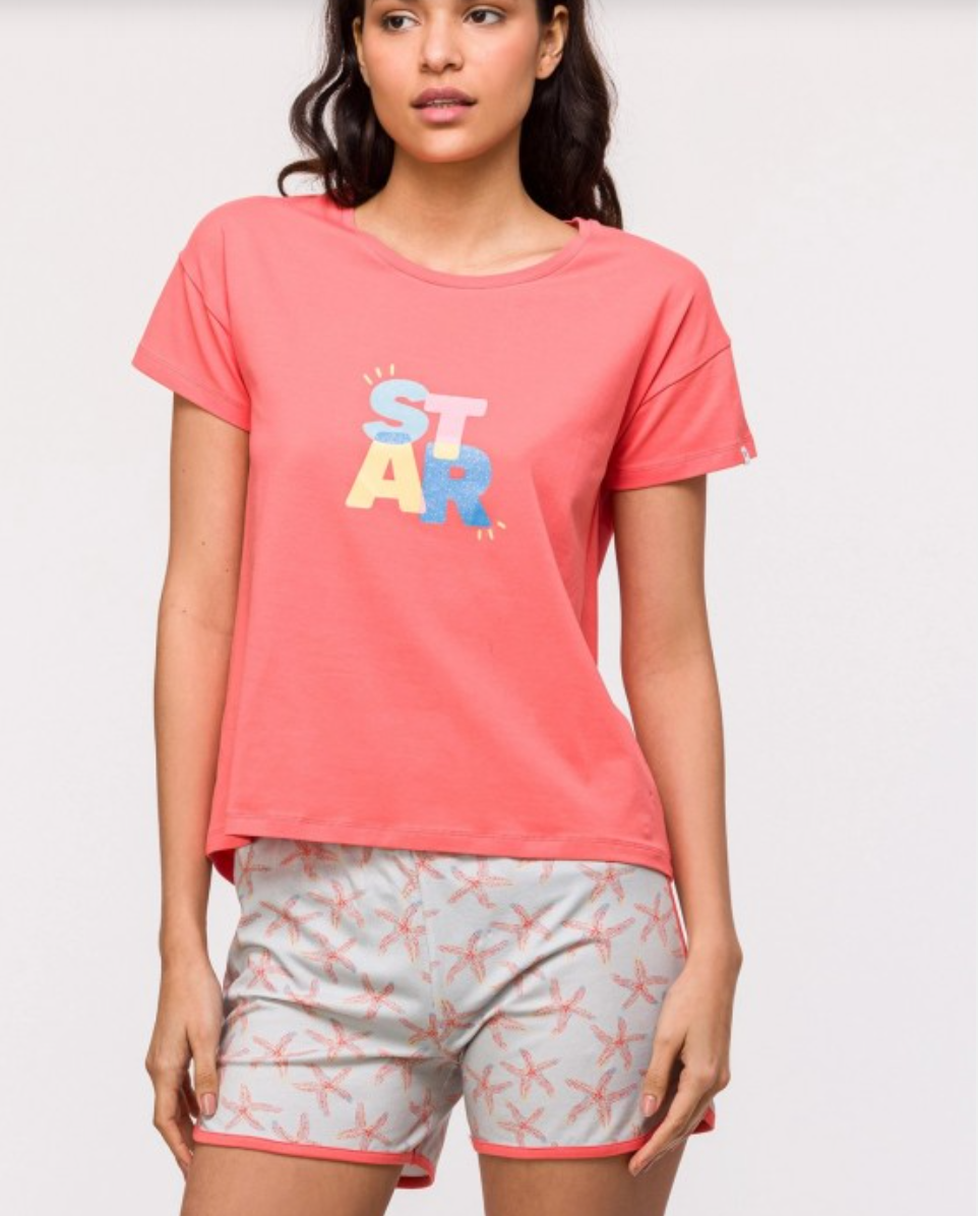 Ontdek onze heerlijk comfortabele pyjama, vervaardigd uit soepel en rekbaar katoen. Het soepelvallende T-shirt is versierd met de opdruk "STAR", terwijl het sportieve shortje wordt gekenmerkt door een leuk koraalrood boordje en een prachtige zeesterrenprint.
